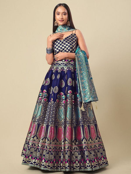 Woven Design Navy Blue Semi-Stitched Lehenga Choli