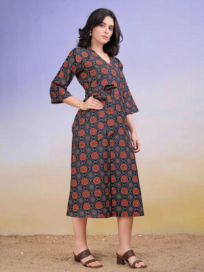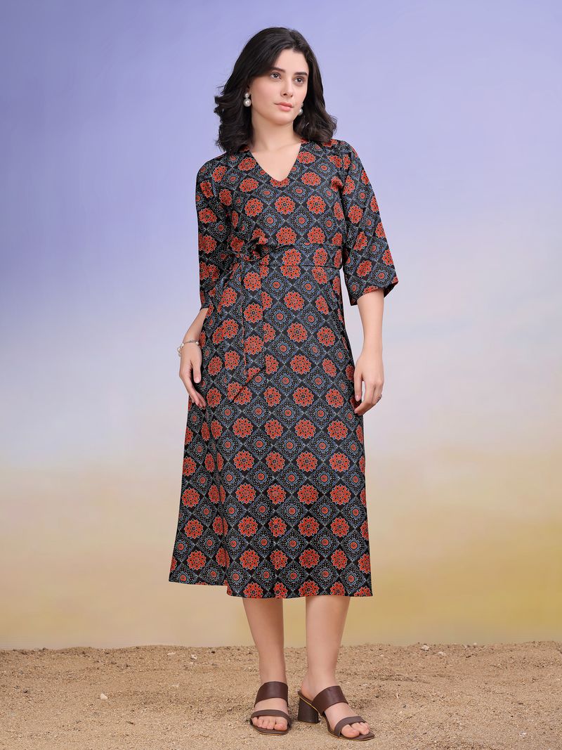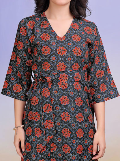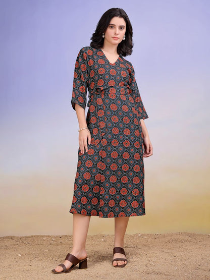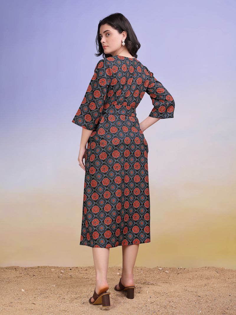 Women's Elegant Wrap Midi Bell Sleeves & Tie-Up Waist Black Dress