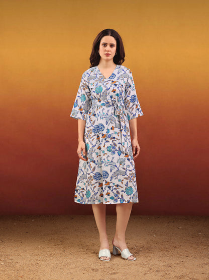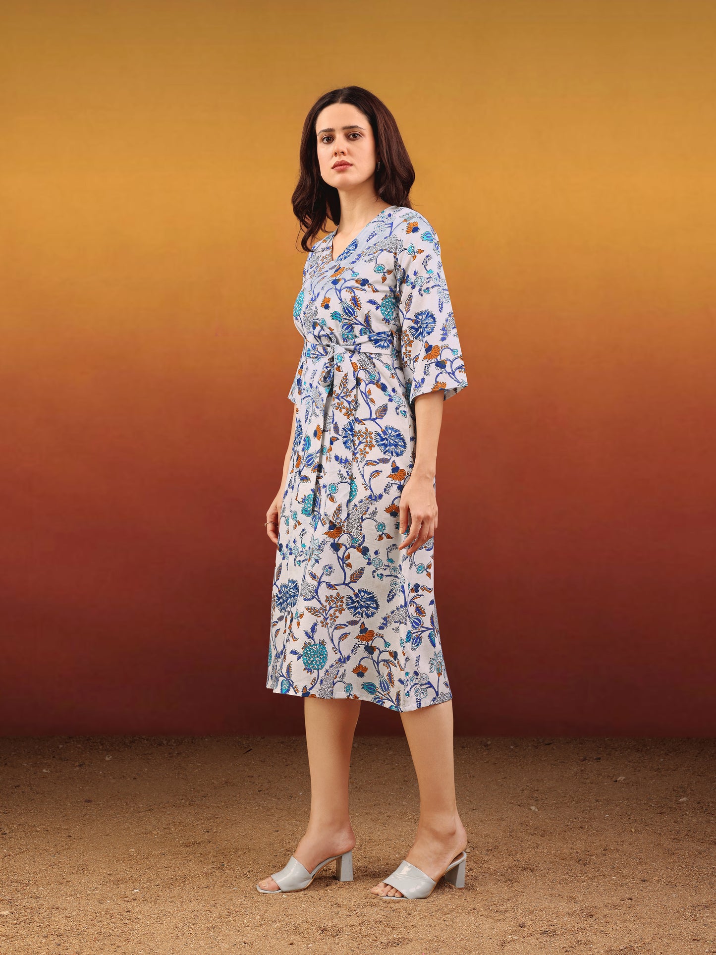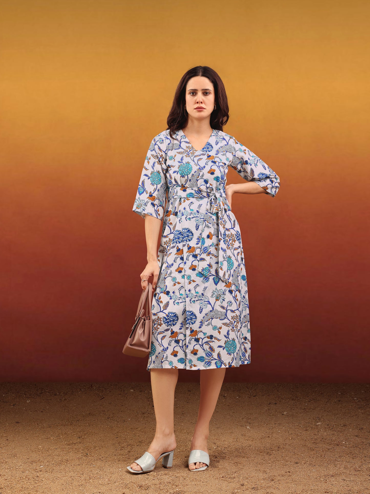Women's Elegant Wrap Midi Bell Sleeves & Tie-Up Waist Black Dress