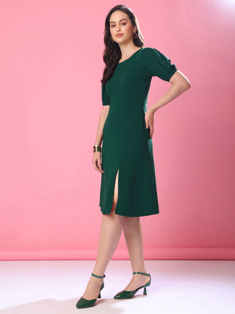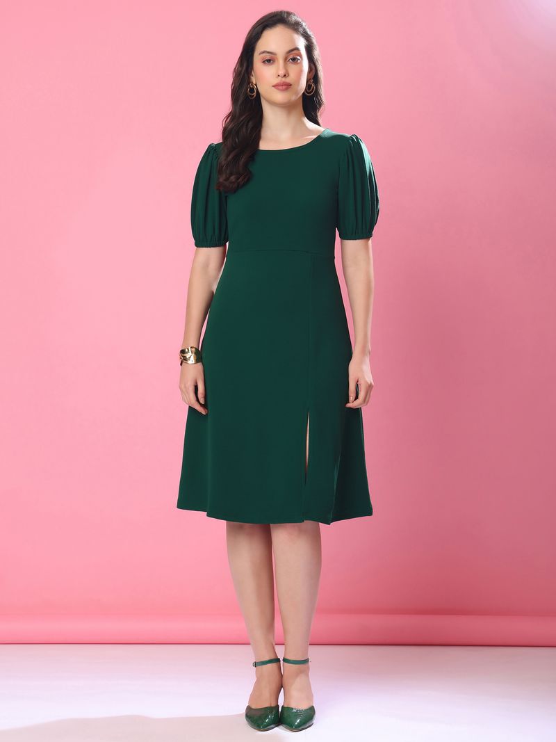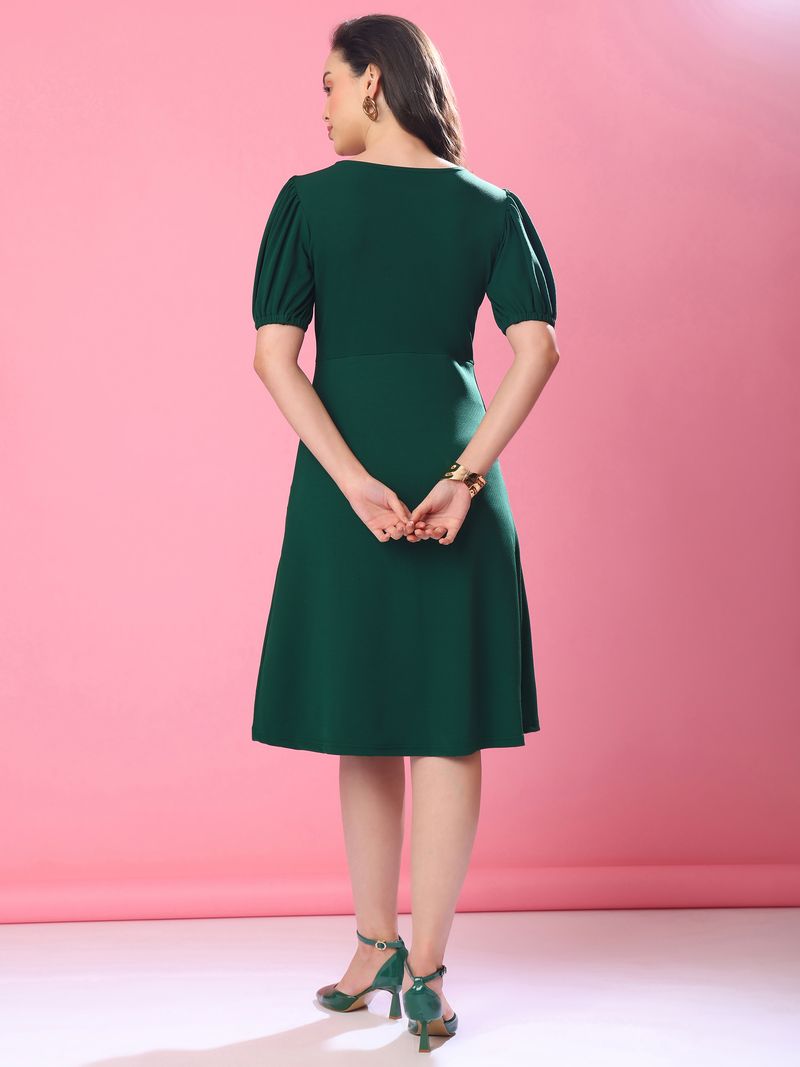 Women's Green Fit & Flared Above Knee Short Sleeve Dress