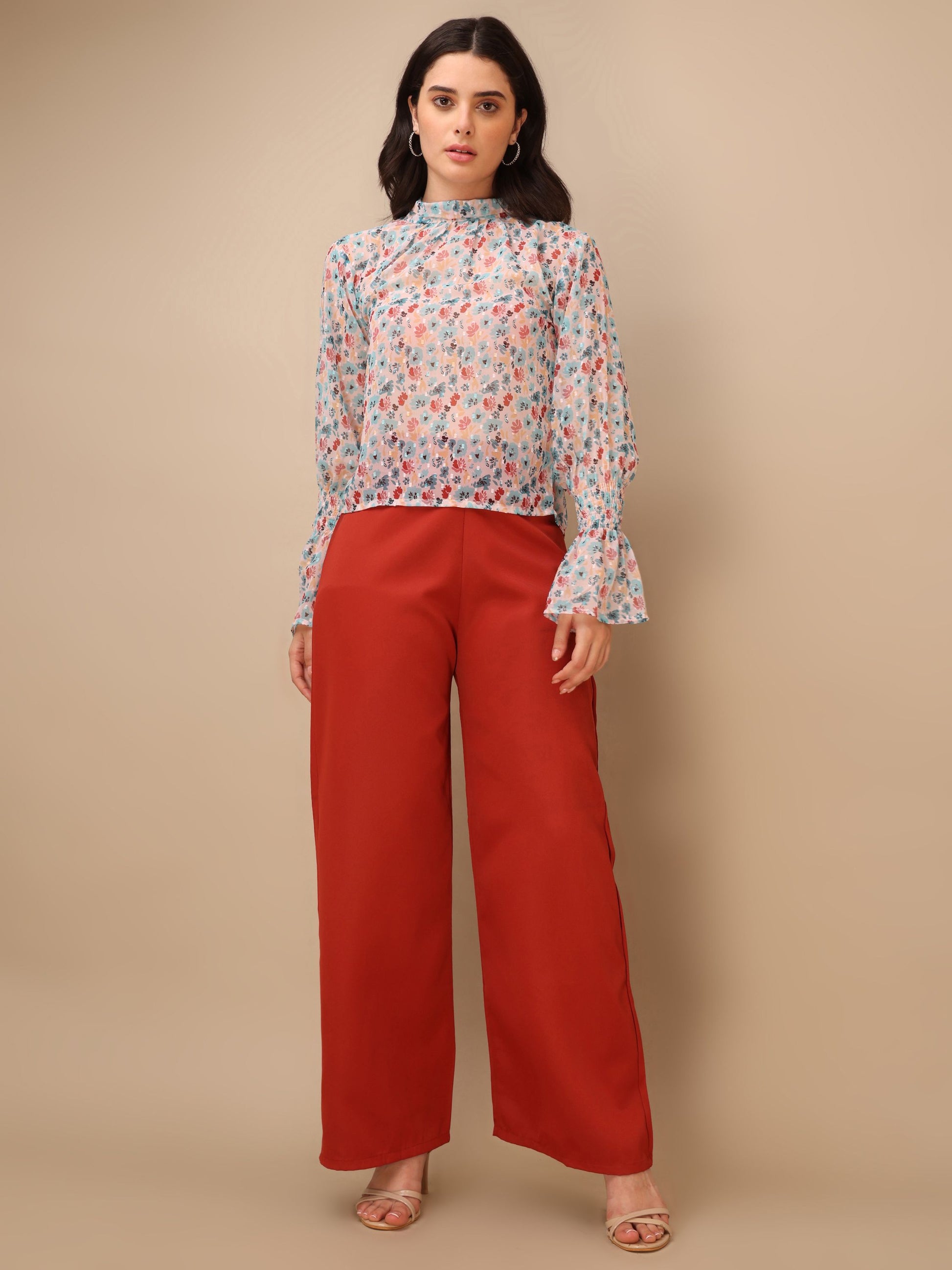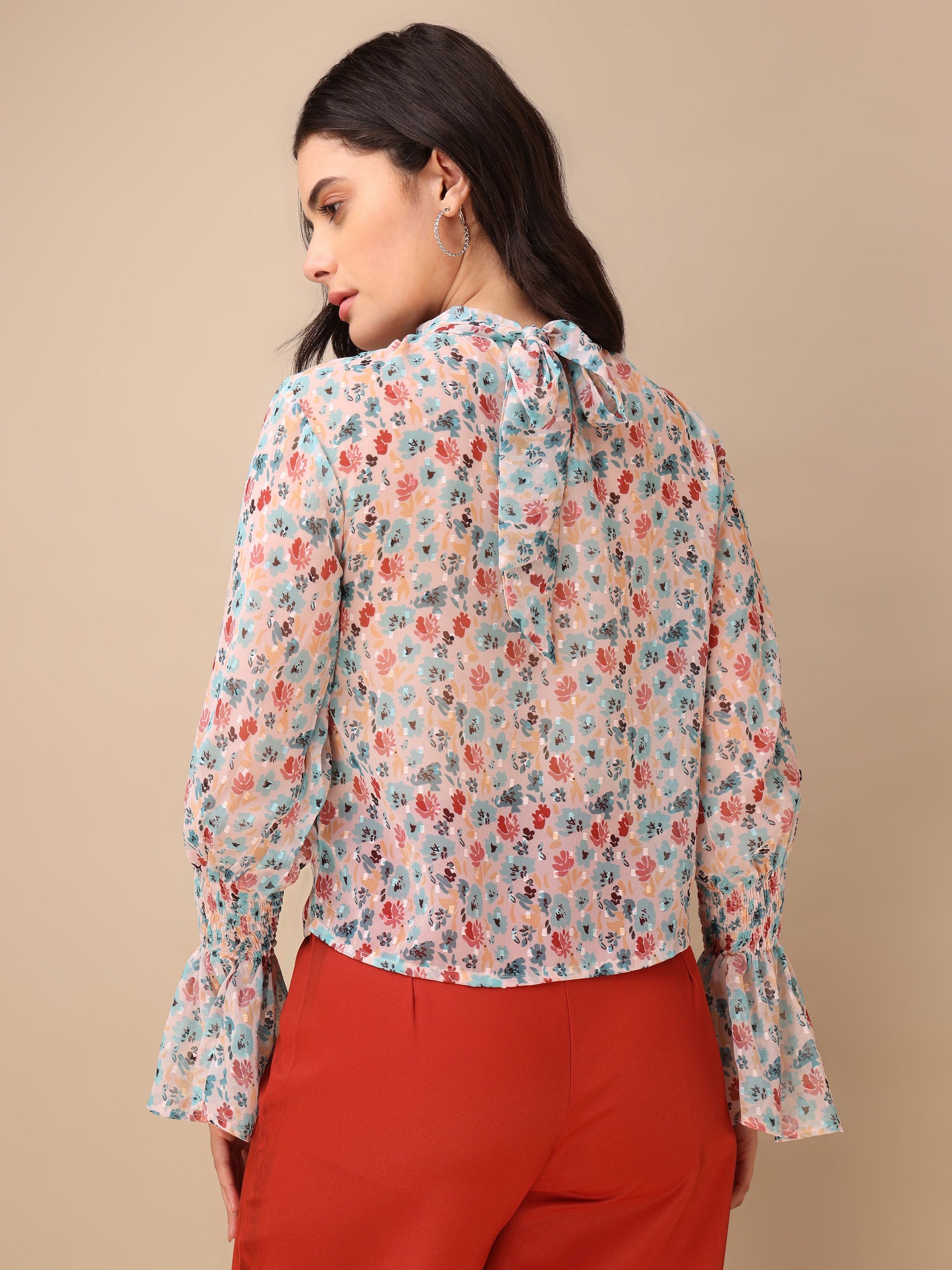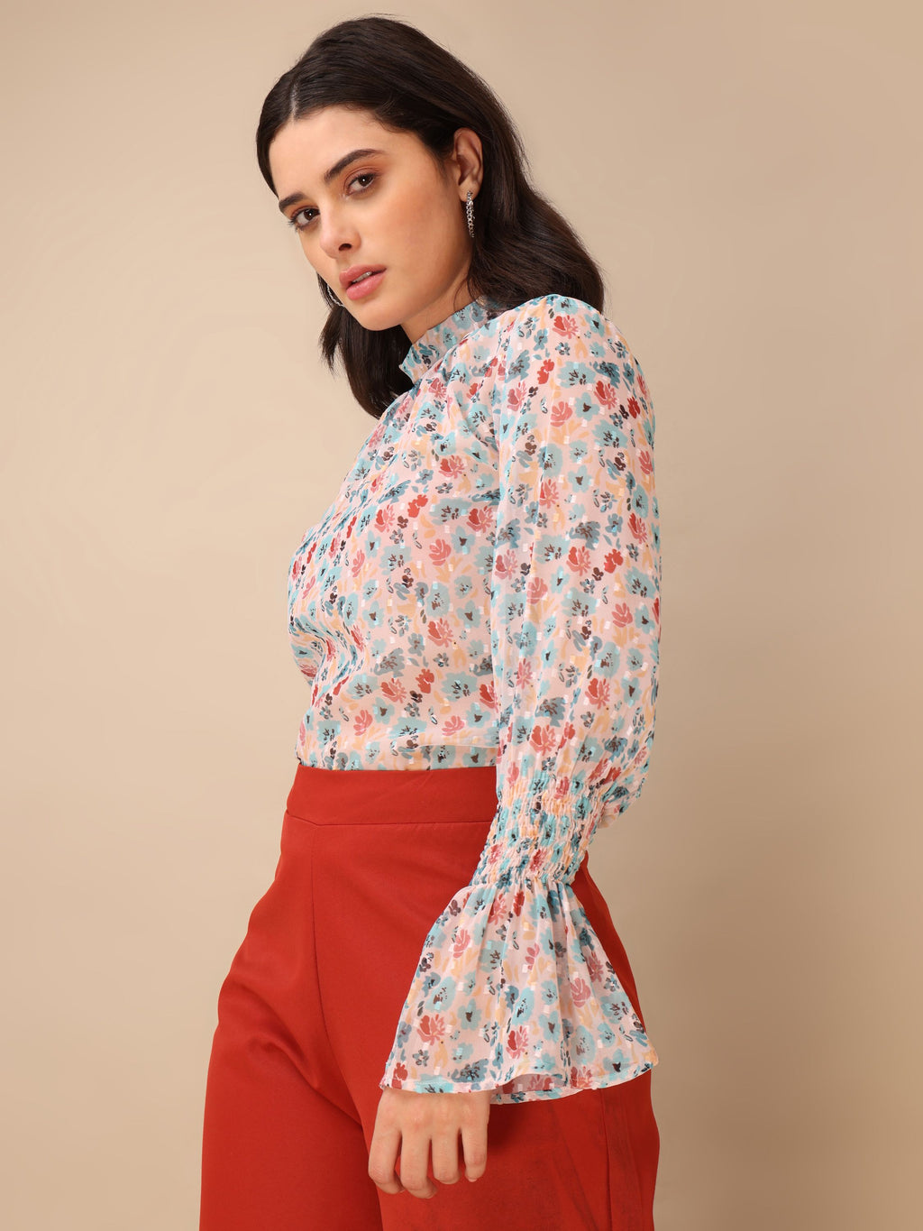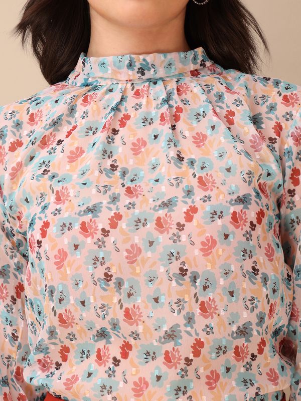 Womens's Multi Long Sleeve High Neck Printed Ruched Top