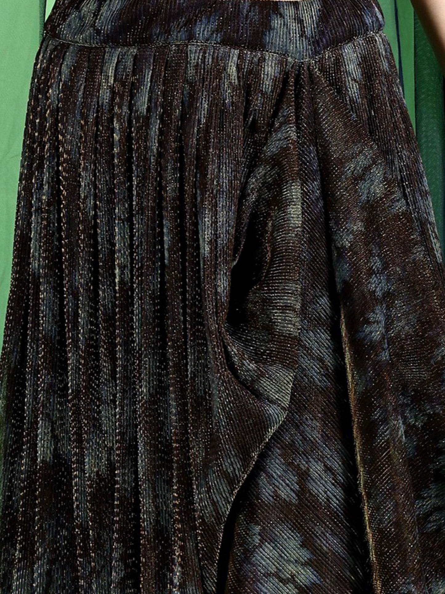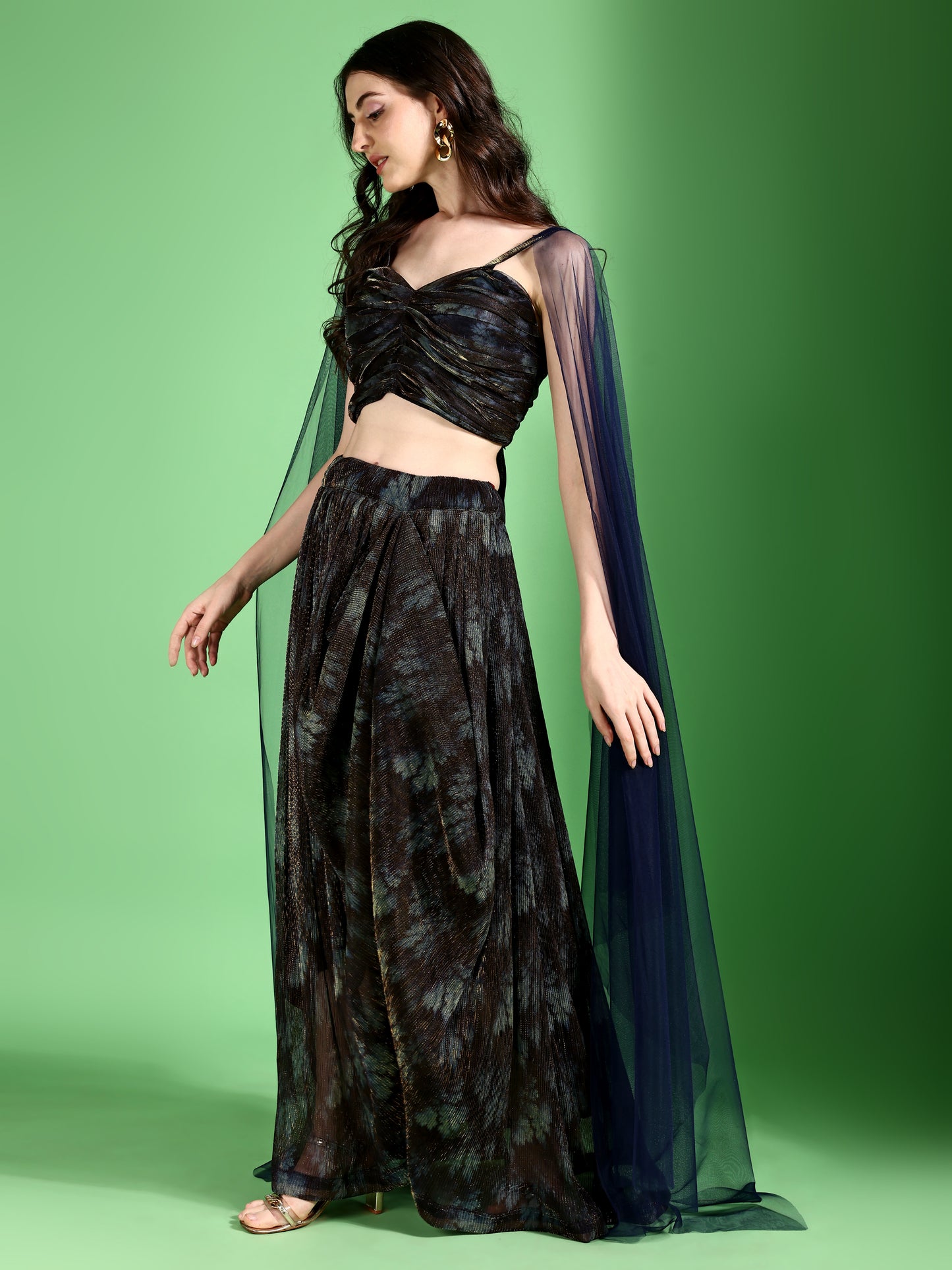The western-style lehenga choli is a contemporary take on traditional attire, combining elegance with modern design elements. The outfit is crafted from printed lycra crush fabric, offering a rich texture and a comfortable fit. The lehenga is designed in a dhoti- style wrap, which adds a trendy and unique twist to the ensemble. The look is further enhanced by a stylish net dupatta, which drapes gracefully, adding a layer of sophistication. The entire ensemble features dark colors, creating a striking and bold appearance suitable for evening events or festive occasions.