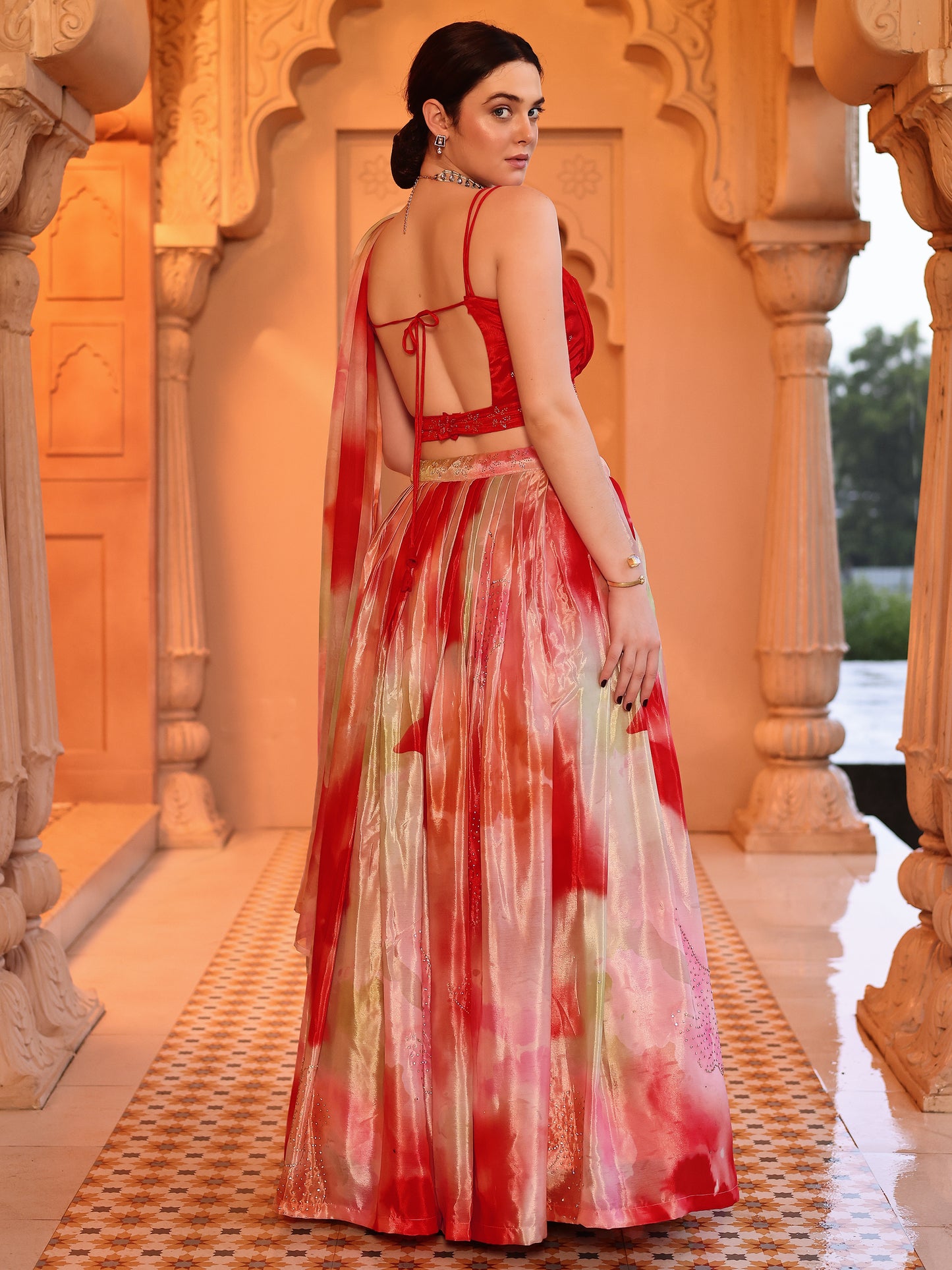 Step into the spotlight with our exquisite Printed Lehenga Choli, crafted from luxurious Chinon fabric. This stunning ensemble features vibrant, bright colors that capture the essence of traditional Indian festivities. The lehenga is adorned with intricate ethnic motifs, meticulously embellished with Swarovski and Jarkan work, adding a touch of opulence to your look. Complementing the lehenga is a soft organza dupatta, beautifully printed and finished with delicate tassels, adding an extra layer of elegance. This outfit is perfectfor weddings, festive celebrations, or any special occasion where you want to make a statement.